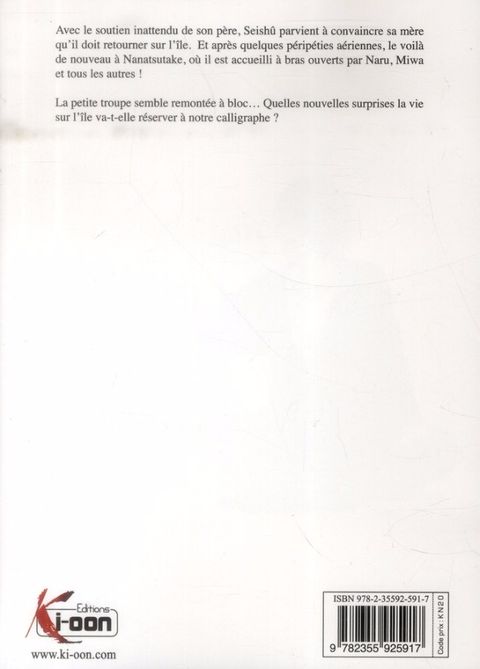Avec le soutien inattendu de son père, Seishû parvient à convaincre sa mère qu'il doit retourner sur l'île. Et après quelques péripéties aériennes, le voilà de nouveau à Nanatsutake, où il est accueilli à bras ouverts par Naru, Miwa et tous les autres ! La petite troupe semble remontée à bloc... Quelles nouvelles surprises la vie sur l'île va-t-elle réserver à notre calligraphe ?