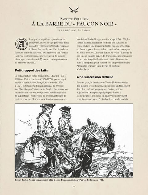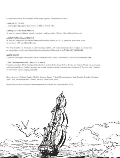La collaboration entre le jeune Patrice Pellerin et le scénariste chevronné Jean-Michel Charlier ne dura que le temps des Trafiquants de bois d'ébène et des Révoltés de la Jamaïque. Deux Barbe-Rouge plus réalistes et plus adultes qu'à l'accoutumée, qui constitueront un véritable galop d'essai pour le futur créateur de L'Épervier. Nous les rassemblons pour la première fois dans cette intégrale, qui sera agrémentée d'un dossier de Brieg Haslé, avec de nombreux inédits.