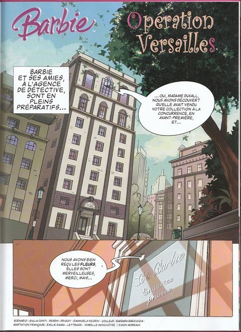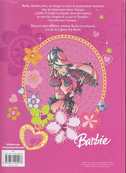 Barbie détective privée, est envoyée au coeur de passionnantes aventures, vêtue de somptueuses tenues d'époque. Le fidèle M. Gadget la propulse, dans cette mission, au coeur des intrigues de la Cour de Versailles ! C'est parti pour l'aventure. Découvre dans cet album comment Barbie s'est retrouvée à la tête de l'agence B et Barbie.