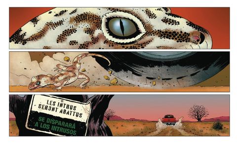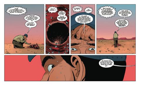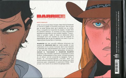Liddy, propriétaire d'un ranch, vit à Pharr, ville du sud Texas. Elle est sur le point de faire une rencontre inattendue : celle d'Oscar, un Hondurien qui a réussi à franchir la frontière mexico-américaine. Sur les terres de Liddy, Oscar se retrouve braqué à bout portant par la Texane. Mais tout à coup, une troisième entité intervient et les kidnappe... Liddy et Oscar s'entraident bien malgré eux, obligés d'unir leurs forces pour tenter de s'enfuir. Ils réalisent peu à peu que ce qui les séparait n'est rien face à cette rencontre du troisième type ! « BARRIER est une nouvelle réflexion éclairante des auteurs de PRIVATE EYE sur notre société, et une exploration de la nature humaine dont nous limitons le potentiel par méconnaissance de l'autre. Au-delà de ce qui pourrait n'être qu'une déclaration d'intention, BRIAN K. VAUGHAN et MARCOS MARTIN proposent une véritable expérience linguistique à leurs lecteurs. Conformément à leur projet, certains passages de cet album ont été conservés en espagnol. Aussi, il faudra au non-hispanophone s'investir dans une lecture active et aller au-devant d'une langue peut-être inconnue pour comprendre le parcours d'Oscar. Faire un pas vers l'autre et sa culture en quelque sorte... »
