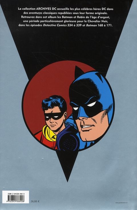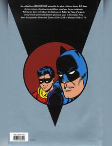 Batman et Robin aux prises avec des adversaires quasiment tombés dans l'oubli : le Pingouin et le Sphinx ? Le Justicier masqué et L'adolescent prodige face à M. Mammouth et au Criquet ? Pas de doute : vous avez entre vos mains la "nouvelle version" du tandem phare de DC imposée par le légendaire rédacteur Julius Schwartz ! Lorsqu'en 1964 Schwartz prend les rênes de " Batman " et " Détective Comics ", c'était déjà un grand habitué des remaniements à succès. Sa recette pour relancer le justicier de Gotham ? Confronter les héros à des criminels ordinaires et privilégier un style visuel plus moderne, comparable à ce qu'il a fait auparavant pour remettre au goût du jour Flash et Green Lantern. Comme vous pourrez le constater en lisant cet ouvrage, Schwartz a choisi la formule gagnante. Ajoutez-y les dialogues aux petits oignons de France Herron et Gardner Fox et les coups de crayon affûtés de Carminé Infantino et Shelly Moldoff, et vous comprendrez très vite pourquoi ces histoires ont servi à définir l'âge d'argent des comics. Les lecteurs ne sont pas les seuls à avoir apprécié ce changement de direction. Impressionné par la renaissance de notre tandem de choc, Hollywood a décidé de diffuser une série télé consacrée à Batman, à peine un an après la publication des épisodes réunis dans ce recueil. Très vite, nos deux héros ont vu leur popularité grimper en flèche, et surtout, les comics ont commencé peu à peu à trouver grâce auprès du grand public. \0