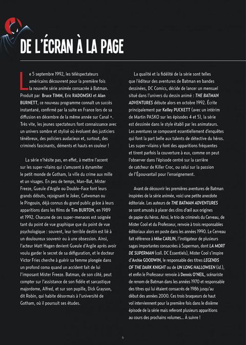 Des cellules de l'asile d'Arkam aux ruelles malfamées de la ville, le Chevalier Noir veille. Gotham City et lui ne font qu'un. Ce nouvel arc des aventures de Batman démarre très fort, en témoigne l'alliance du Joker et du Pingouin. Une série directement inspirée de la célèbre série animée de Bruce Timm et Paul Dini.