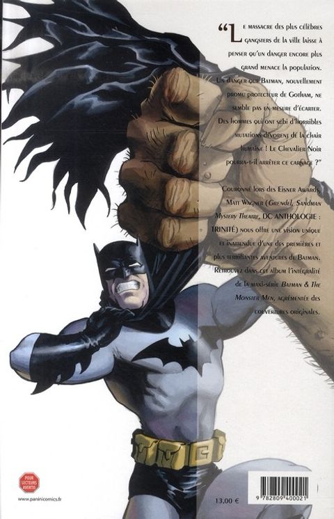Le massacre des plus célèbres gangsters de la ville laisse à penser qu'un danger encore plus grand menace la population. Un danger que batman, nouvellement promu protecteur de gotham, ne semble pas en mesure d'écarter. des hommes qui ont subi d'horribles mutations dévorent de la chair humaine ! le chevalier noir pourra-t-il arrêter ce carnage ? couronné lors des eisner awards, matt wagner (grender, sandman mystery theatre, dc anthologie : trinité) nous offre une vision unique et inattendue d'une des premières et plus terrifiantes aventures de batman. Retrouvez dans cet album l'integralité de la maxi-série batman & the monster men, agrémentée des couvertures originales.