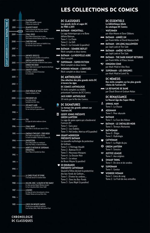 Ce tome a la particularité de ne pas avoir de grande incidence dans le run de Morrison. Il n'y a que les premiers numéros qui en font partie et les suivants racontent une enquête au passé, présent et futur de Batman (Bruce, Dick et Damian). Le reste étant majoritairement des numéros (...) Voir le commentaire
