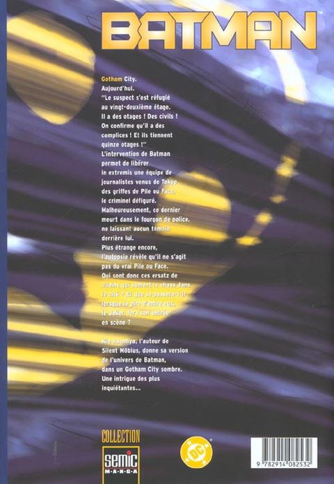 Orphelin, seul dans la nuit, il a juré de venger le meurtre de Thomas et Martha Wayne, ses parents. Milliardaire le jour, il revêt le manteau de la chauve-souris quand le soir tombe. Il est le protecteur de Gotham. Il est Batman. Dans l'univers expressionniste d'un Gotham nocturne, entre les ruelles obscures et les sportlights de la police, la silhouette de Batman se faufile vers des aventures inédites.