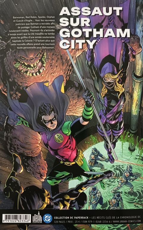 Batwoman, Red Robin, Spoiler, l'Orpheline et Gueule d'Argile... Voici les nouveaux justiciers que Batman a recrutés afin de protéger Gotham d'une menace totalement inédite. Pourront-ils s'accorder à temps avant que la cité maudite ne tombe entre les griffes d'une armée souterraine baptisée la Colonie ? D’autant plus que cette nouvelle affaire prend une tournure toute personnelle pour Batwoman.
