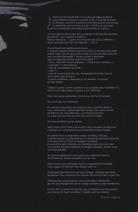 Quel lien secret Batman et le Joker partagent-ils avec une jeune fille mystérieuse ? Kidnappée par le Joker, le Chevalier noir doit plonger dans les profondeurs de Gotham City et s'engager dans une course contre la montre pour la retrouver. Les enjeux sont importants, et pour Batman, c'est personnel ! Retrouvez le fabuleux diptyque d'Enrico Marini consacré à Batman dans cette intégrale composée d'une jaquette inédite et de cinq pages supplémentaires de cahier graphique.