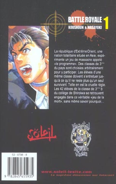 Un peu différent de l'adaptation cinéma, ce manga dérangeant et nihiliste vous plongera dans l'univers impitoyable du Battle Royale... Dans un futur proche, le gouvernement japonais, décidé à lutter contre l'echec et la violence scolaire, lance le programme ""Battle Royale"", un ""grand jeu"" ultra violent dans lequel une classe se retrouve sur une île, avec pour seule consigne : se massacrer les uns les autres...