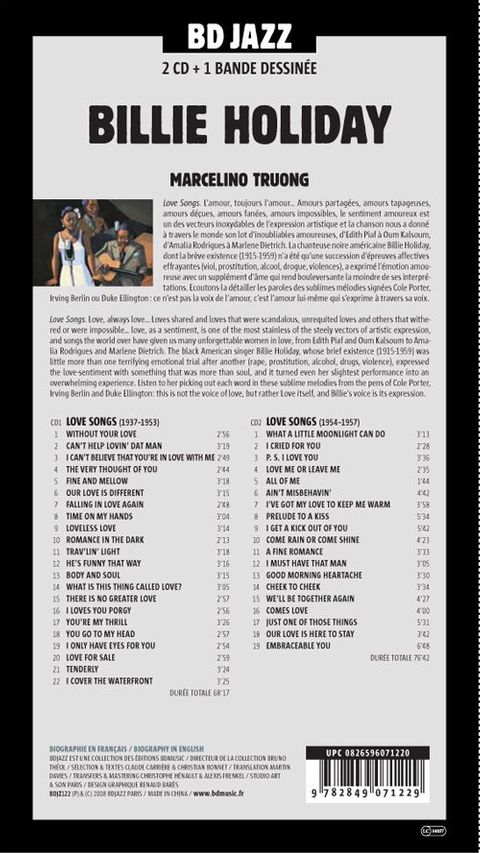 Love Songs. L'amour, toujours l'amour... Amours partagées, amours tapageuses, amours déçues, amours fanées, amours impossibles, le sentiment amoureux est un des vecteurs inoxydables de l'expression artistique et la chanson nous a donné à travers le monde son lot d'inoubliables amoureuses, d'Edith Piaf à Oum Kalsoum, d'Amalia Rodrigues à Marlene Dietrich. La chanteuse noire américaine Billie Holiday, dont la brève existence (1915-1959) n'a été qu'une succession d'épreuves affectives effrayantes (viol, prostitution, alcool, drogue, violences), a exprimé l'émotion amoureuse avec un supplément d'âme qui rend bouleversante la moindre de ses interprétations. Ecoutons-la détailler les paroles des sublimes mélodies signées Cole Porter, Irving Berlin ou Duke Ellington : ce n'est pas la voix de l'amour, c'est l'amour lui-même qui s'exprime à travers sa voix.