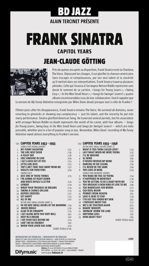 Près de quinze ans après sa disparition, Frank Sinatra reste Le Chanteur, The Voice. Dépassant les clivages, il sut glorifi er la chanson américaine. Sans trucages ni complaisances, par son seul talent et la sincérité qu'il mettait dans ses interprétations. Frank Sinatra traversa plusieurs périodes. Celle qui l'associa à l'arrangeur Nelson Riddle représente sans doute le sommet de sa carrière. « Songs For Young Lovers », « Swing Easy », « In The Wee Small Hours », « Songs For Swingin' Lovers ! », quatre albums issus de leur collaboration, parfaitement incontournables. Faut-il rappeler que la version de My Funny Valentine enregistrée par Miles Davis devait presque tout à celle de Frankie ?