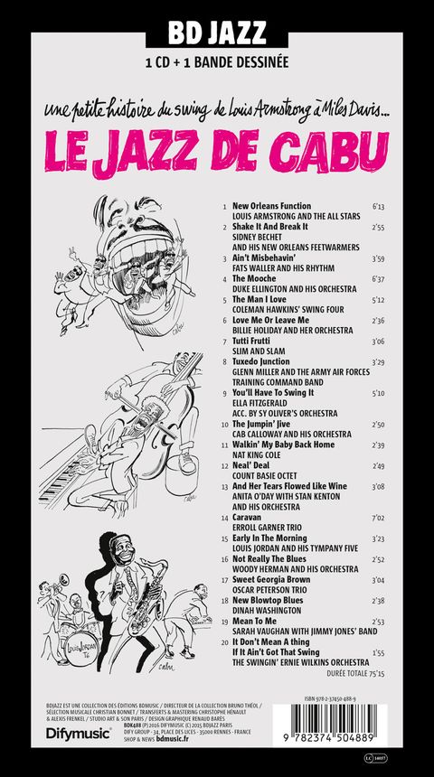 Entre Cabu et le Jazz, Chacun le Sait, c'était une Vieille Histoire D'Amour... Pendant Plus de Cinquante Ans, sa Frange Juvénile, ses Lunettes et son Carnet de Croquis Ont Discrètement Arpenté les Salles de Concerts et les Festivals où l'on Célébrait les Vertus de cette Musique Roborative Chère à son Coeur. l'Artiste Avait par Ailleurs au Fil du Temps Mis son Talent d'Illustrateur au Service de Plusieurs Collections de Cds Anthologiques (cabu Masters Of Jazz, Cabu Jazz Masters, Bdjazz) sur les Couvertures Desquelles son Coup de Crayon Magique Avait Fait Merveille. que ce Soit en « Live » ou en « Différé » ses Dessins, Croquis, Esquisses et Autres Ebauches Brillent de Mille Eclats, dont la Véracité, l'Humour, la Poésie et la Complicité ne Sont pas les Moindres. la Collection Bdjazz, en Présentant ce Florilège de ses Portraits de Jazzmen, Est Particulièrement Fière de Rendre Hommage à Celui qui Fut Pendant Plusieurs Années son Indéfectible Compagnon de Swing. les Dessins de Cabu, à l'Instar de leurs Modèles, Dégagent un Swing Contagieux...