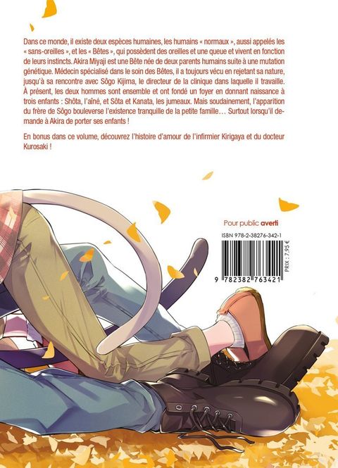 Dans ce monde, il existe deux espèces humaines, les humains " normaux ", aussi appelés les " sans-oreilles ", et les " Bêtes ", qui possèdent des oreilles et une queue et vivent en fonction de leurs instincts. Akira Miyaji est une Bête née de deux parents humains suite à une mutation génétique. Médecin spécialisé dans le soin des Bêtes, il a toujours vécu en rejetant sa nature, jusqu'à sa rencontre avec Sôgo Kijima, le directeur de la clinique dans laquelle il travaille.À présent, les deux hommes sont ensemble et ont fondé un foyer en donnant naissance à trois enfants : Shôta, l'aîné, et Sôta et Kanata, les jumeaux. Mais soudainement, l'apparition du frère de Sôgo bouleverse l'existence tranquille de la petite famille... Surtout lorsqu'il demande à Akira de porter ses enfants !