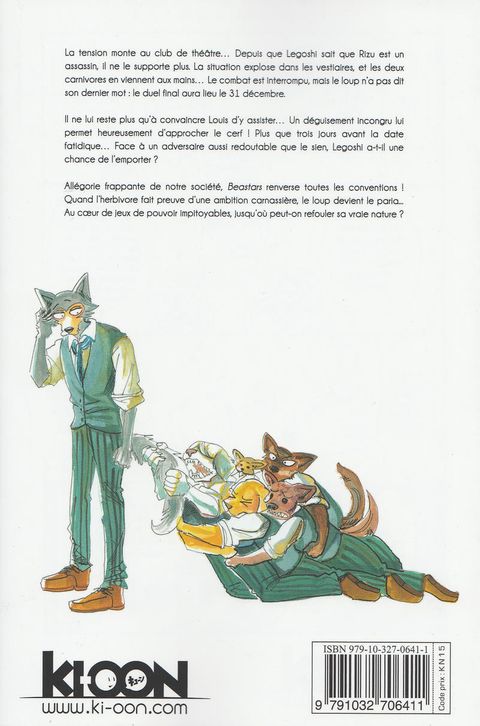 La tension monte au club de théâtre… Depuis que Legoshi sait que Rizu est un assassin, il ne le supporte plus. La situation explose dans les vestiaires, et les deux carnivores en viennent aux mains… Le combat est interrompu, mais le loup n’a pas dit son dernier mot : le duel final aura lieu le 31 décembre. Il ne lui reste plus qu’à convaincre Louis d’y assister… Un déguisement incongru lui permet heureusement d’approcher le cerf ! Plus que trois jours avant la date fatidique… Face à un adversaire aussi redoutable que le sien, Legoshi a-t-il une chance de l’emporter ?