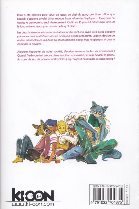 Haru a été enlevée pour servir de repas au chef du gang des Lions ! Alors que Legoshi s'apprête à voler à son secours, Louis refuse de s'impliquer... Qu'à cela ne tienne, le carnivore ira seul. Heureusement, Gohin est là pour lui prêter main-forte, et le loup arrive à temps pour sauver celle qu'il aime ! Les deux lycéens se retrouvent seuls dans la ville nocturne, avec juste assez d'argent pour une chambre d'hôtel. Dans ce moment d'intimité suffocante, Legoshi décide de révéler à la lapine ce qui pèse sur sa conscience depuis trop longtemps : lui aussi a déjà failli la dévorer...