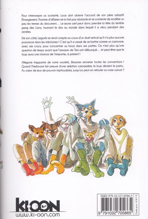 Pour interrompre sa scolarité, Louis doit obtenir l’accord de son père adoptif. Étrangement, l’homme d’affaires ne lui fait pas obstacle et se contente de modifier un peu les termes du document… Le jeune cerf peut donc prendre la tête du terrible gang des Lions, tournant le dos au monde dans lequel il a vécu pendant des années. De son côté, Legoshi se rend compte au cours d’un duel amical qu’il n’a plus aucune puissance dans les mâchoires ! C’est qu’il a cessé de se battre comme un carnivore, avec ses crocs, pour concentrer sa force dans ses pattes. Ce n’est plus qu’une question de temps avant que l’assassin de Tem soit débusqué… et peut-être que le loup aura une chance de l’emporter, à présent !
