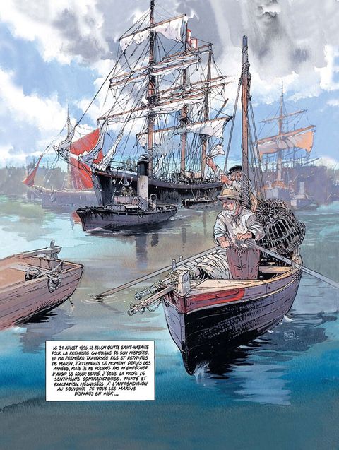 "La première traversée du Belem sur fond dintrigue policière"Le 31 Juillet 1896, le Belem, propriété de larmateur Fernand Crouan, quitte les chantiers de Saint-Nazaire et met le cap Montevideo pour le compte de la chocolaterie Meunier. Il y parvient cinquante jours plus tard avec à son bord douze hommes déquipage, le pilotin et le capitaine Lemerle dont cest le dernier voyage avant la retraite. Il gagne Belem trente jours plus tard, chargé de 121 mules. Un incendie à bord provoque la révolte de léquipage qui doit affronter lintransigeance du vieux capitaine. Cest à la suite de négociations houleuses que le navire finit par revenir à Nantes le 26 janvier 1987, après 46 jours dune traversée difficile. Du moins c'est ce que nous savons, car il apparaît que la réalité serait tout autre ! Ce premier voyage du Belem se lit comme une véritable histoire daventure aux multiples rebondissements, avec pour toile de fond le rude quotidien des matelots aux temps héroïques de la marine à voile. Il existe plusieurs réimpressions avec même isbn mais des dos différents. L'EO est celle avec l'AI d'octobre 2006