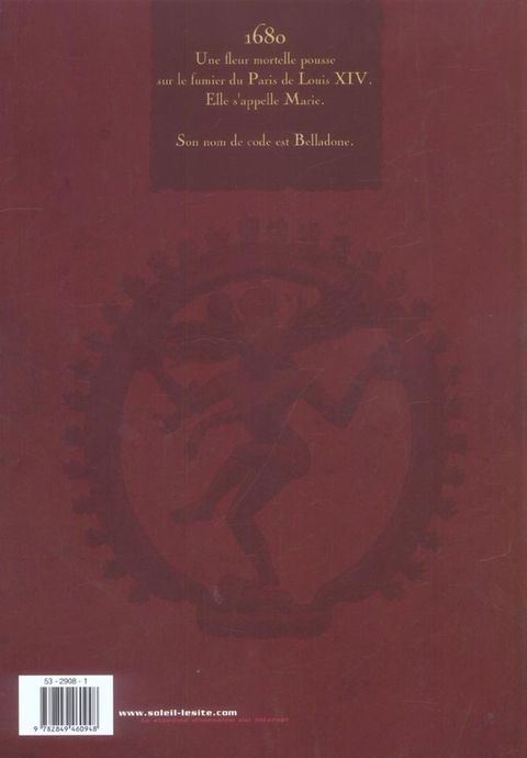NIKITA AU TEMPS DES MOUSQUETAIRES ! DES DOUVES DE VENDÉE AUX DOUVES DE LA COUR DES MIRACLES, DE VERSAILLES À PONDICHERY, BELLADONE MÊLE RÉALITÉ HISTORIQUE ET ROMANESQUE. 1680, le ministre Louvois crée la Chambre Secrète, un service clandestin réunissant les meilleurs agents spéciaux du royaume. Parmi eux, une jeune femme, Marie, sort du lot. Son nom de code ? Belladone. Tandis que Marie accomplit une mission secrète, en province, au service du Ministre Louvois, Maxime s'entraîne pour prendre sa revanche contre celui qui a attenté, par deux fois, à la vie du Roi. Mais il ignore que l'assassin italien et son maître remontent la piste de la fleur la plus vénéneuse, Belladone. Usant des plus ignobles chantages, semant la peur et la mort, ils feront tout pour la recruter dans leurs rangs, et faire payer ceux qui les ont fait échouer.