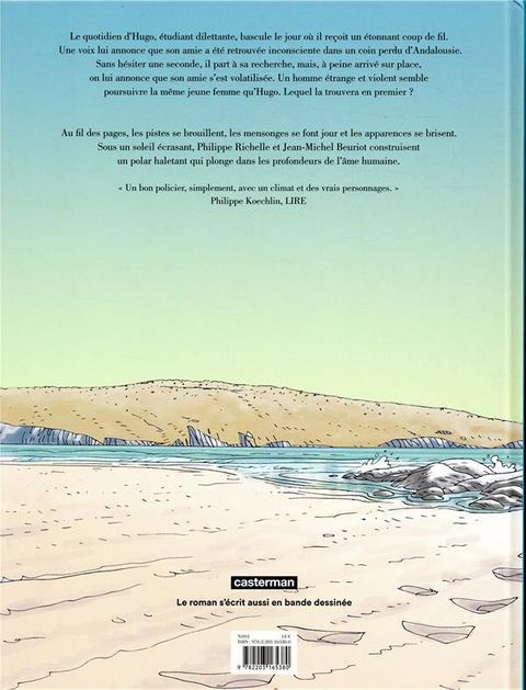 Reporté le 24 juin La vie d’Hugo, dilettante estudiantin, bascule le jour où il reçoit un coup de fil étonnant. La voix lui annonce que son amie a été retrouvée inconsciente dans un coin perdu d’Espagne. Bien qu’il soit célibataire, titillé par le destin, il se rend sur place. Mais là, personne ! Une vague description va le pousser à rechercher une inconnue. Qui est-elle ? Pourquoi le fascine-t-elle autant ? Le lecteur découvre rapidement qu’elle intéresse également un autre homme, assez louche, plus proche du malfrat que du détective privé par ses méthodes musclées. Décidément, cette inconnue dont nous ne savons quasi rien attire bien du monde. Qui la retrouvera en premier ? Et comment savoir que c’est elle ? Le scénario à tiroirs de Philippe Richelle balade le lecteur de Séville à Barcelone. Le soleil tape à rendre fou. Le dessin de Beuriot nous écrase de chaleur. Comment voir clair dans cette obscure clarté ?