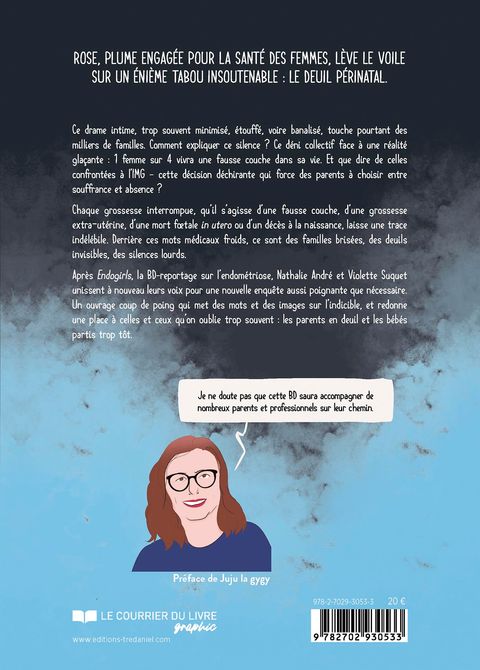 Rose, plume engagée pour la santé des femmes, lève le voile sur un énième tabou insoutenable : le deuil périnatal. Ce drame intime, trop souvent minimisé, étouffé, voire banalisé, touche pourtant des milliers de familles. Comment expliquer ce silence ? Ce déni collectif face à une réalité glaçante : 1 femme sur 4 vivra une fausse couche dans sa vie. Et que dire de celles confrontées à l'IMG – cette décision déchirante qui force des parents à choisir entre souffrance et absence ? Chaque grossesse interrompue, qu'il s'agisse d'une fausse couche, d'une grossesse extra-utérine, d'une mort fœtale in utero ou d'un décès à la naissance, laisse une trace indélébile. Derrière ces mots médicaux froids, ce sont des familles brisées, des deuils invisibles, des silences lourds. Les chiffres parlent d'eux-mêmes : 200 000 fausses couches chaque année en France 16 000 grossesses extra-utérines 7 000 interruptions médicales de grossesse 4 000 bébés morts in utero Et pourtant, si peu de mots, si peu d'écoute et un silence assourdissant. Après Endogirls , la bd-reportage sur l'endométriose, Nathalie André et Violette Suquet unissent à nouveau leurs voix pour une nouvelle enquête aussi poignante que nécessaire : Bercer le silence . Un ouvrage coup de poing qui met des mots et des images sur l'indicible, et redonne une place à celles et ceux qu'on oublie trop souvent : les parents en deuil et les bébés partis trop tôt.