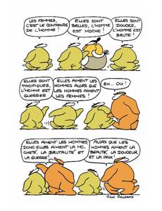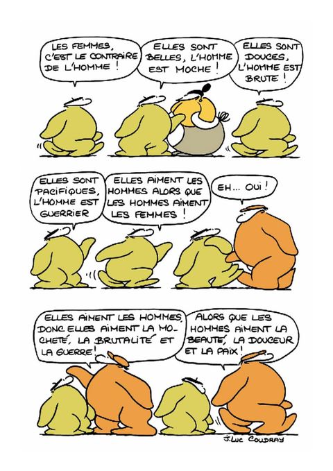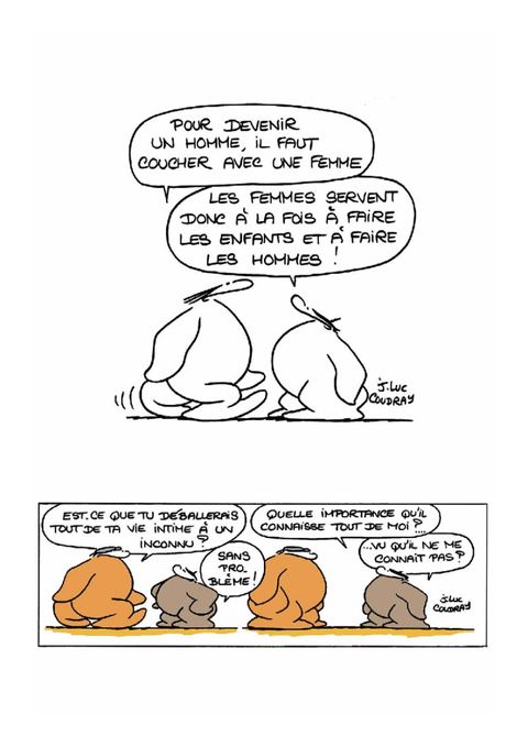 Béret ou casquette vissée sur la tête, deux hommes dissertent de l'air du temps. En quelques répliques, Jean-Luc Coudray met en scène des réflexions sur la vie ordinaire qui révèlent les petites contradictions de notre temps. Politique, art, religion, problèmes de société, tous les sujets sont abordés avec esprit et humour. Servies par un graphisme simple et rond, ces conversations se jouent habilement du langage et rendent chaque lecteur un peu philosophe... Entre Le Chat (Geluck) et Le Baron noir (Got et Pétillon), des strips d'humour aussi irrésistibles que pertinents...