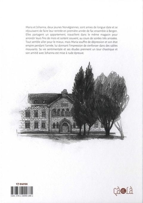 Bergen, deuxième plus grande ville de Norvège, est le cadre d'un récit partiellement autobiographique, dans lequel Anja Dahle Overbye raconte comment une amitié entre deux jeunes femmes est mise à l'épreuve par la dépression de l'une d'elles. Maria et Johanna sont amies de longue date et elles se réjouissent de faire leur rentrée en première année de fac ensemble. Elles partagent un appartement, travaillent dans le même magasin de vêtements pour arrondir leurs fins de mois et sortent beaucoup, au cours de soirées très arrosées. Mais Maria souffre de dépression et son état empire pendant l'année ; elle cumule les aventures sans lendemain alors qu'elle est en couple et boit de plus en plus. Elle se met à sécher les cours et elle a le sentiment de s'enfoncer dans des sables mouvants. Il faudra toute la patience de son amie et de sa thérapeute pour que Maria parvienne à progressivement s'en sortir. Dans ce deuxième roman graphique, Anha Dahle Overbye aborde avec délicatesse et pudeur la thème de la dépression chez les jeune dans un récit qui est dans le prolongement des tensions entres adolescentes décrites dans son précédent livre, Sous le signe du grand chien.