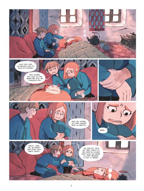 La fin du voyage. Molly, Liam et Sarah ont réussi miraculeusement à s'extirper du labyrinthe caverneux qu'ils empruntaient pour atteindre les terres mortes. Ils ont été secourus par des villageois éleveurs de chiens. Ils sont encore sous le choc de ce qui s'est passé en sortant de la grotte, un éboulement les a séparés de leurs compagnons de route et le sort de ces derniers est incertain. Tandis que les habitants du village envoient une expédition pour les secourir, les enfants ne peuvent faire qu'une chose : attendre et espérer... L'arrivée au village leur a permis une découverte inespérée. Liam a retrouvé Adam, son frère qu'il n'avait pas vu depuis 10 ans est bien vivant. Tant de questions à lui poser... Qu'est-il arrivé aux autres hommes ? Où en est la guerre ? Le père de Molly est-il encore vivant ? Pour obtenir des réponses à toutes ces questions, et trouver un remède au mal qui ronge Molly et Liam, le voyage se poursuit. Les blessures se font chaque jours plus profondes mais le groupe devra encore affronter moult péripéties pour atteindre les terribles terres mortes en restant soudé. Bergères Guerrières est de ces séries qui se bonifient d'album en album. Dans ce quatrième et dernier tome, Jonathan Garnier et Amélie Fléchais signent le point final d'une oeuvre éblouissante. Un objet graphique somptueux pour une épopée merveilleuse, magique et inoubliable peuplée de personnages incroyablement attachants.