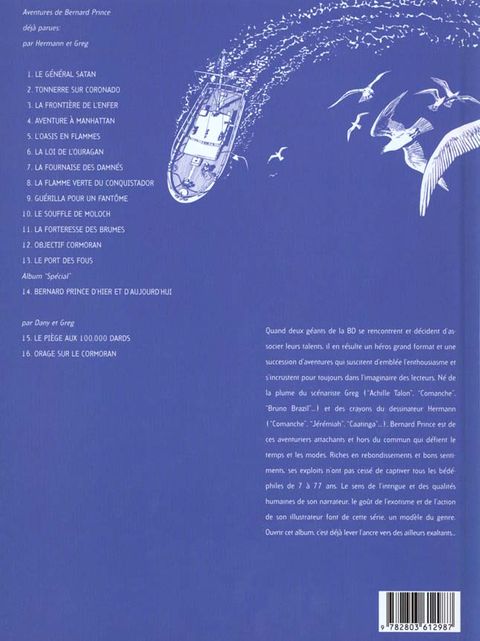 Quand deux géants de la BD se rencontrent et décident d'associer leurs talents, il en résulte un héros grand format et une succession d'aventures qui suscitent d'emblée l'enthousiasme et s'incrustent pour toujours a la plume du scénariste Greg ("Achille Talon", "Comanche", "Bruno Brazil"...) et des crayons du dessinateur Hermann ("Comanche", "Jérémiah", "Caatinga"...). Bernard Prince est de ces aventuriers attachants et hors du commun qui défient le temps et les modes. Riches en rebondissements et bons sentiments, ses exploits n'ont pas cessé de captiver tous les bédéphiles de 7 à 77 ans. Le sens de l'intrigue et des qualités humaines de son narrateur, le goût de l'exotisme et de l'action de son illustrateur font de cette série, un modèle du genre. Ouvrir cet album, c'est déjà lever l'ancre vers des ailleurs exaltants