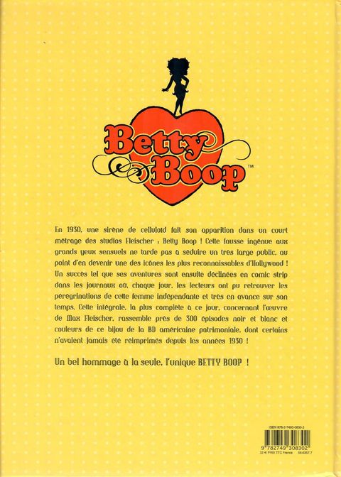 En 1930, une sirène de celluloïd fait son apparition dans un court métrage des studios Fleischer : Betty Boop ! Mêlant innocence et sensualité, la demoiselle ne tarde pas à séduire un très large public et à devenir l'un des sex symbols de l'âge d'or de l'animation américaine, qui est même censurée un temps à cause de sa jupe trop courte ! Un succès tel que ses aventures sont ensuite déclinées en comic strip dans les journaux où, chaque jour, les lecteurs ont pu retrouver les pérégrinations de cette femme indépendante et très en avance sur son temps. Cette intégrale, la plus complète concernant l'oeuvre de Max Fleischer, rassemble près de 300 épisodes noir et blanc et couleurs de ce bijou de la BD américaine patrimoniale, dont certains n'avaient jamais été réimprimés depuis les années 1930 ! Introduit par une préface de l'actuel directeur des studios Fleischer, voici le plus bel hommage qui puisse être rendu à l'une des plus grandes icônes du XXe siècle. Boop-boop-a-doop !