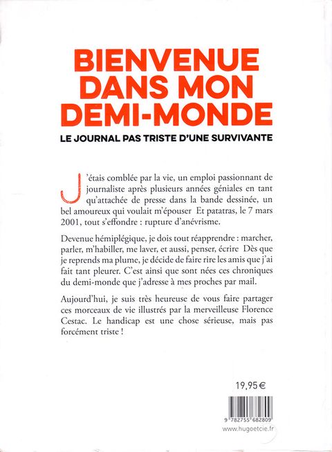 Le journal pas triste d'une survivante " "Fuck", c'est le premier mot que j'ai écrit sur mon ardoise quelques jours après l'accident. Je sentais que je n'étais pas en bon état, mon gosier me torturait, ma tête était couverte de bandages qui faisaient des tours et des tours. Fuck, j'ai perdu mon côté gauche, me voici plongée dans le demi- monde, celui de l'hémiplégie. Et puisqu'un malheur n'arrive jamais seul, dans l'urgence les pompiers qui m'ont sauvé, m'ont introduit un tuyau dans la gorge pour éviter que je n'étouffe. Leur engin est parti de travers, il a déchiré ma trachée. " Ce livre, qui est le journal de bord d'une résurrection, est un véritable remède à la détresse. Comment une jeune femme si durement atteinte peut donc parler de sa situation tragique avec tant d'humour ? C'est une magnifique leçon de vie et d'espoir que Caroline donne à tous ceux qui souffrent. Florence Cestac a spécialement réalisé une trentaine de dessins qui finit de donner le ton à cet album : plutôt que d'en pleurer, apprenons à sourire et même à rire de nos malheurs.