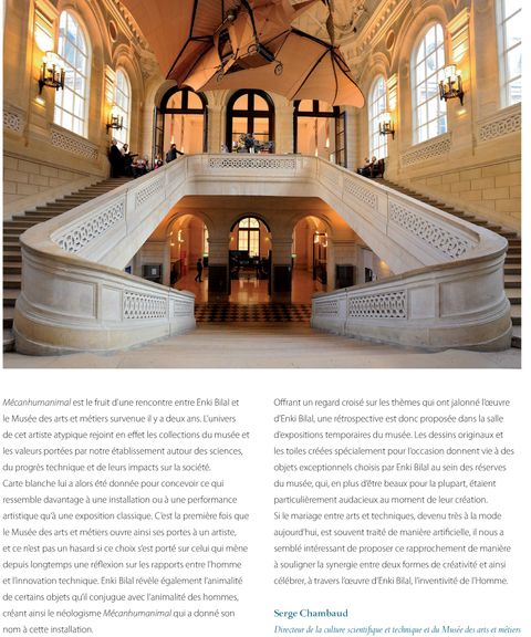 Nourri de nombreuses contributions inédites, un grand album fait écho à l’exposition consacrée à Enki Bilal par le Musée des arts et métiers. Récemment célébré et fortement médiatisé au Musée du Louvre avec l’exposition « Les Fantômes du Louvre », Enki Bilal revient au sommaire de l’actualité au début de l’été avec une autre grande exposition dans un lieu de prestige parisien : le Musée des Arts et Métiers. Inaugurée le 3 juin, cette exposition sera ouverte au public en continu jusqu’en février 2014 et s’accompagne d’un ouvrage qui lui fait écho, publié par Casterman. Sous-titré Mecanhumanial, l’album est un livre qui prolonge l’exposition, par l’image et par les mots. Structuré autour du travail graphique de Bilal dans tous ses aspects y associe de nombreux objets inattendus tirés du fonds du musée, les uns et les autres se répondant pour bâtir un imaginaire et un paysage mental inédits. Divers auteurs invités, complètent ce panorama en donnant, leur vision de l’aventure de la technique et de l’humain. La direction ainsi que l’introduction générale de l’ouvrage sont assurées par le commissaire de l’exposition, Benoît Mouchart assisté de Gaëtan Akyuz.