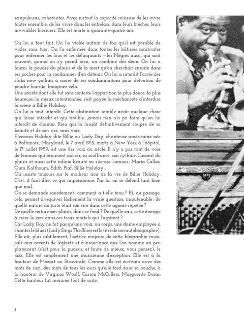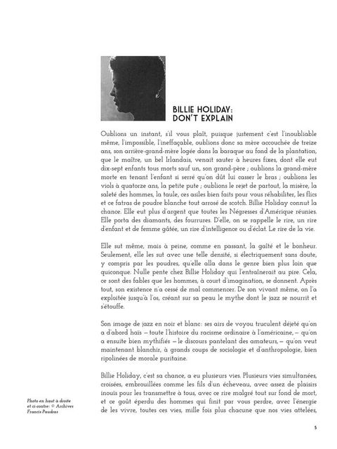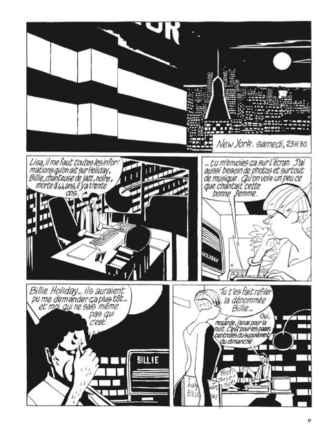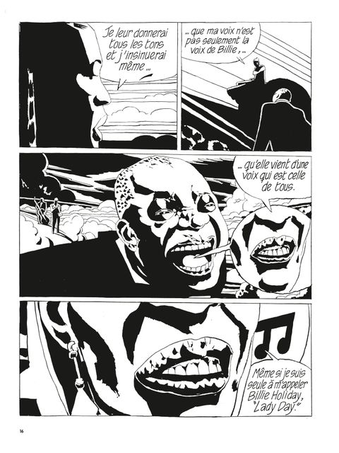 Née à Baltimore en 1915, disparue à New York en 1959, Billie Holiday est devenue une chanteuse de jazz mythique. Parce qu’aujourd’hui encore sa voix réussit à toucher de nombreuses personnes, un journaliste part sur les traces de cette artiste pour le compte d’un quotidien newyorkais. Au-delà des scandales publics qui ont entaché la vie de la star (alcool, drogue, violence…), il cherchera à restaurer la vérité, en investissant la mémoire de Billie. À la lueur de cette enquête, Muñoz et Sampayo retracent, sur fond de racisme et dans le sillage du blues, la lente dérive d’une chanteuse qui exprima la fêlure la plus profonde du jazz.