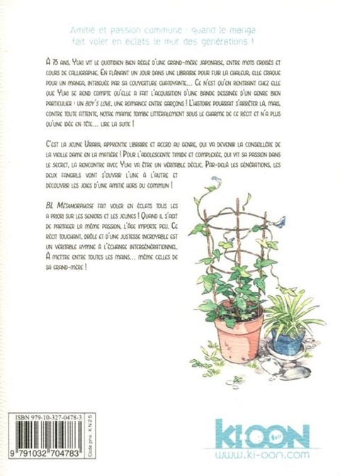 A 75 ans, Yuki vit le quotidien bien réglé d'une grand-mère japonaise, entre mots croisés et cours de calligraphie. En flânant un jour dans une librairie pour fuir la chaleur, elle craque pour un manga, intriguée par sa couverture chatoyante... Ce n'est qu'en rentrant chez elle que Yuki se rend compte qu'elle a fait l'acquisition d'une bande dessinée d'un genre bien particulier : un boy's love, une romance entre garçons ! L'histoire pourrait s'arrêter là, mais, contre toute attente, notre mamie tombe littéralement sous le charme de ce récit et n'a plus qu'une idée en tête... lire la suite ! C'est la jeune Urara, apprentie libraire et accro au genre, qui va devenir la conseillère de la vieille dame en la matière ! Pour l'adolescente timide et complexée, qui vit sa passion dans le secret, la rencontre avec Yuki va être un véritable déclic. Par-delà les générations, les deux fangirls vont s'ouvrir l'une à l'autre et découvrir les joies d'une amitié hors du commun ! BL Métamorphose fait voler en éclats tous les a priori sur les seniors et les jeunes ! Quand il s'agit de partager la même passion, l'âge importe peu. Ce récit touchant, drôle et d'une justesse incroyable est un véritable hymne à l'échange intergénérationnel. A mettre entre toutes les mains... même celles de sa grand-mère !