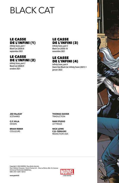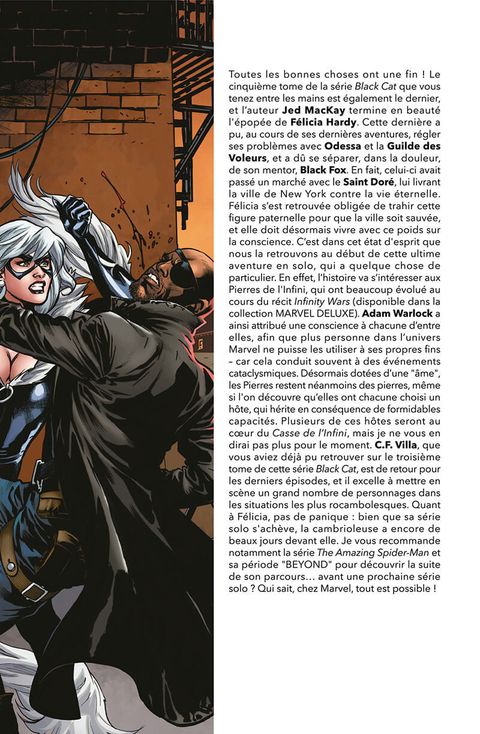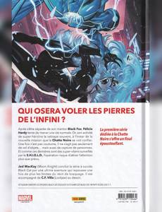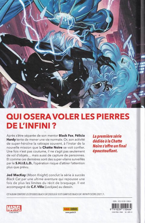 La Chatte Noire a pour mission de voler les Pierres de l'Infini... mais est-elle informée que les pierres sont maintenant des êtres vivants ? Nick Fury voit cette mission d'un mauvais oeil ! Mais au fait, qu'est-ce que Felicia Hardy compte faire des reliques qui ont permis à Thanos d'annihiler la moitié de l'humanité ? Jed Mackay (Moon Knight, Timeless), l'un des auteurs à suivre chez Marvel en ce moment, boucle les aventures de Felicia Hardy en faisant grimper l'action à un niveau inédit. Une série qui a su trouver son public grâce à son humour et son exploration de tous les recoins de l'univers Marvel.