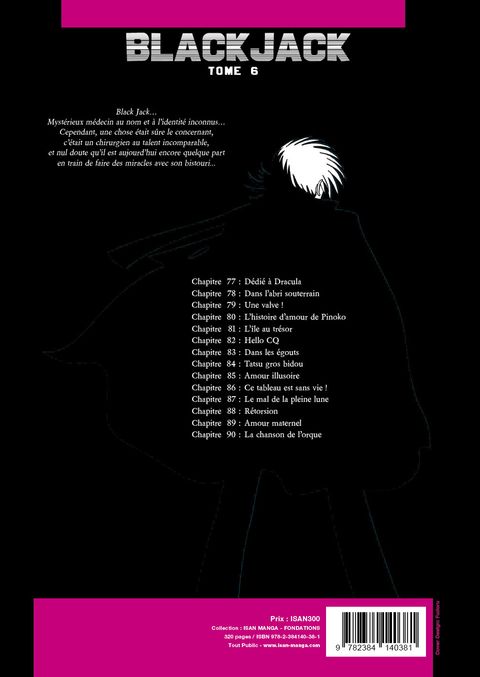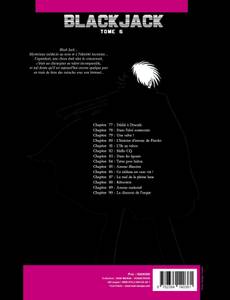 Black Jack, chirurgien sans diplôme qui opère dans la clandestinité et qui demande des sommes astronomiques pour ses interventions, est un personnage ténébreux et hors-la-loi. Il passe sa vie à sauver celle des autres. En revanche, la société médicale refuse de l'admettre comme médecin. Ils nient même son existence. Black Jack pratique tranquillement dans sa petite clinique avec son assistante Pinoko, qu'il a volontairement sauvé auparavant. Des patients, diagnostiqués avec des maladies rares, lui rendent visite avec espoir d'être enfin soignés, quelques soient les circonstances morales. Cette édition de luxe sort à l'occasion du 50eme anniversaire de la série (1973-2023).