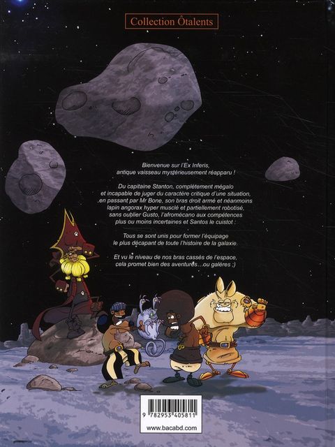 Bienvenue sur l'Ex Inferis, antique vaisseau mystérieusement réapparu ! Du capitaine Stanton, complètement mégalo et incapable de juger du caractère critique d'une situation, en passant par Mr Bone, son bras droit armé et néanmoins lapin angorax hyper musclé et partiellement robotisé, sans oublier Gusto, l'afromécano aux compétences plus ou moins incertaines et Santos le cuistot : Tous se sont unis pour former l'équipage le plus décapant de toute l'histoire de la galaxie. Et vu le niveau de nos bras cassés de l'espace, cela promet bien des aventures.. ou galères ;)
