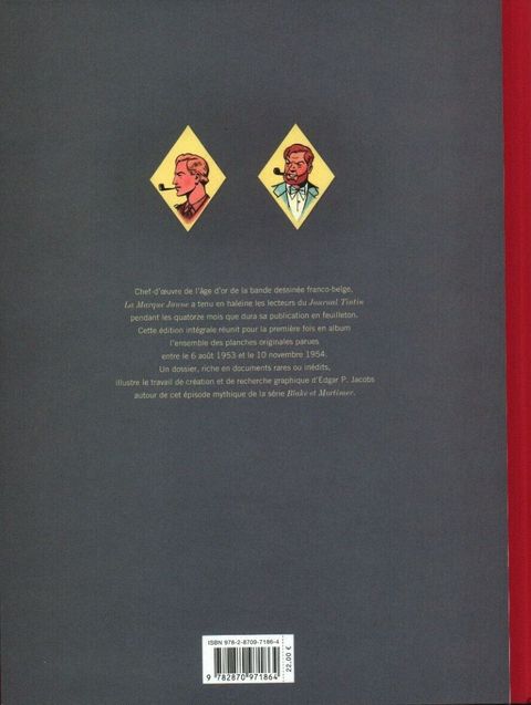Chef-d’œuvre de l'âge d'or de la bande dessinée franco-belge, La Marque Jaune a tenu en haleine les lecteurs du journal tintin pendant les quatorze mois que dura sa publication en feuilleton. Cette édition intégrale réunit pour la première fois en album l'ensemble des planches originales parues entre le 6 août 1953 et 10 novembre 1954. Un dossier, riche en documents rares ou inédits, illustre le travail de création et de recherche graphique d'Edgar P. Jacobs autour de cet épisode mythique de la série Blake et & Mortimer. Cet ouvrage est tiré à seulement 5000 exemplaires et existe avec une couverture alternative.
