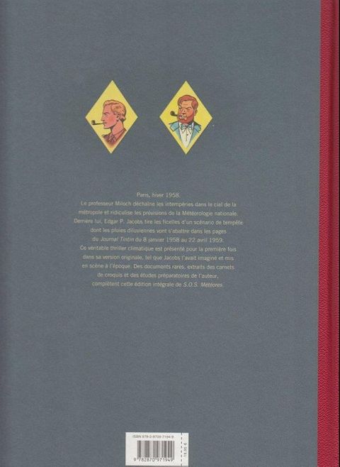 Paris, hiver 1958. Le professeur Miloch déchaîne les intempéries dans le ciel de la métropole et ridiculise les prévisions de la Météorologie nationale. Derrière lui, Edgar P. Jacobs tire les fi celles d'un scénario de tempête dont les pluies diluviennes vont s'abattre dans les pages du Journal Tintin, du 8 janvier 1958 au 22 avril 1959. Ce véritable thriller climatique est présenté pour la première fois dans sa version originale, tel que Jacobs l'avait imaginé et mis en scène à l'époque. Des documents rares, extraits des carnets de croquis et des études préparatoires de l'auteur, complètent cette édition intégrale de S.O.S. Météores.