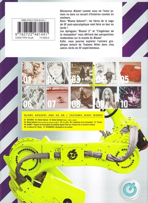 Découvrez Blame! comme vous ne l'avez jamais vu dans ce recueil d'histoires courtes en couleurs. Dans "Blame Gakuen!", les héros de la saga de SF post-apocalyptique vont faire un tour au lycée ! Les épilogues "Blame! 2" et "L'ingénieur de la résosphère" vous offriront des perspectives inattendues sur le monde de Blame! Enfin, vous pourrez explorer l'univers graphique torturé de Tsutomu Nihei dans cinq autres récits de SF expérimentaux.