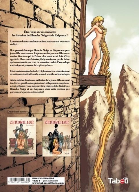 Après le succès de Cendrillon, Trif et Andrea Celestini revisitent aujourd'hui les célèbres contes des frères Grimm : Blanche-neige et Raiponce. Dans cette version, que jamais personne n'avait osé raconter, Blanche-neige devient une jeune fille qui n'a rien d'une petite sainte, la reine une femme fatale qui considère les hommes comme des jouets, Raiponce une jeune fille ingénue, humble et très douce et le prince charmant un obsédé rusé, prêt à tout pour arriver à ses fins. Ce premier volume introduit, plus particulièrement, la très belle reine Grimilde qui n'a que pour obsession sa beauté et sa jeunesse qu'elle désire éternelle. Aider de son miroir magique, qui ne peut mentir, elle sera prête à tous les stratagèmes aussi vicieux qu'ils soient pour être et demeurer la plus belle femme de la contrée des cent royaumes. Avec son dessin tout en finesse empreint d'un réalisme sombre et excitant, Trif nous revient avec cette série prévue en 3 volumes. Les contes de notre enfance cachent décidément bien des choses !