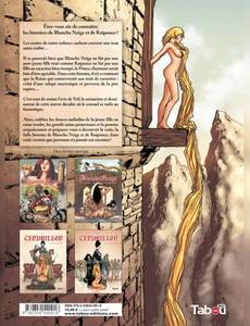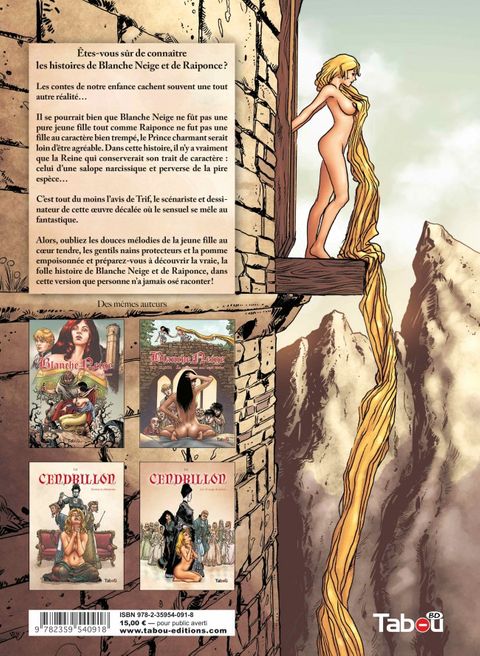 Après le succès de Cendrillon, Trif et Andrea Celestini revisitent aujourd'hui les célèbres contes des frères Grimm : Blanche Neige et Raiponce. Dans cette version, que jamais personne n'avait osé raconter avant eux, Blanche Neige est une jeune fille qui n'a rien d'une sainte, la Reine une femme fatale qui considère les hommes comme des jouets, Raiponce une jeune ingénue, un tantinet niaise et le prince charmant un pervers, prêt à tout pour arriver à ses fins. Alors que le premier volume se concentrait sur la Reine, ce deuxième opus introduit, la très célèbre «princesse aux cheveux noir comme l'ébène et aux lèvres rouge comme le sang» : Blanche Neige. qui pour fuir la jalousie de sa belle-mère se réfugie auprès des sept nains. Elle découvrira que les petits bonshommes sont les gardiens du plus précieux trésor de la Reine : une jeune femme à l'interminable chevelure blonde. et tentera par tous les moyens de libérer la jolie prisonnière de la tour secrète. Avec son dessin tout en finesse empreint d'un réalisme soigneusement sombre et excitant, Trif nous revient avec cette série en 3 volumes. Les contes de notre enfance cachent décidément bien des choses !