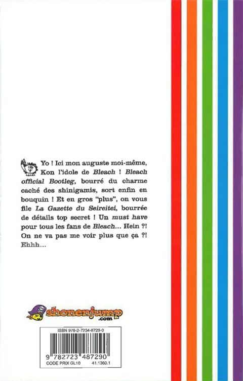 Glénat Manga célèbre la série Bleach cette année ! Dans ce contexte, nous sommes heureux de proposer le Bleach Official Bootleg. Ce livre donne le détail des différents acteurs de Soul Society et des 13 divisions à l’instar d’un guide book. Mais, il contient aussi 72 pages couleurs de séquences bonus où l’auteur joue avec son univers et ses personnages. Sorti en 2007 au Japon, cet ouvrage indispensable est un recueil drôle et plein de fraîcheur qui amène finalement à considérer Tite Kubo sous un jour totalement nouveau !
