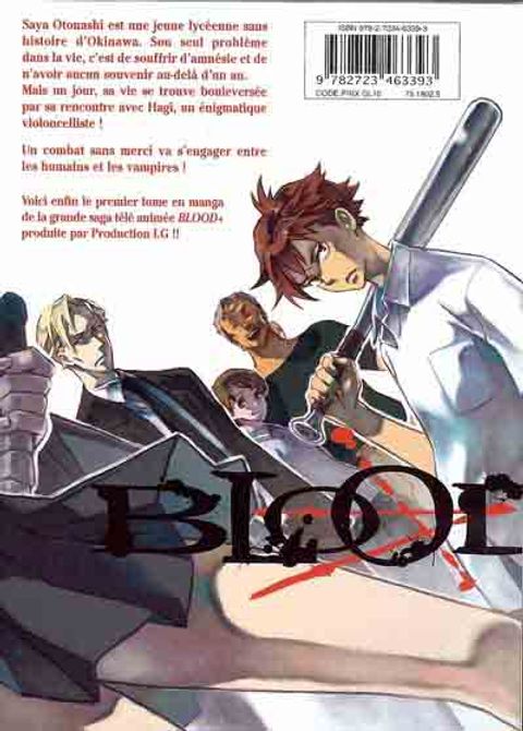 Saya Otonashi est une jeune lycéenne sans histoire d'Okinawa. Son seul problème dans la vie, c'est de souffrir d'amnésie et de n'avoir aucun souvenir au-delà d'un an. Mais un jour, sa vie se trouve bouleversée par sa rencontre avec Hagi, un énigmatique violoncelliste !. Un combat sans merci va s'engager entre les humains et les vampires !. Voici enfin le premier tome en manga de la grande saga télé animée BLOOD+ produite par Production IG