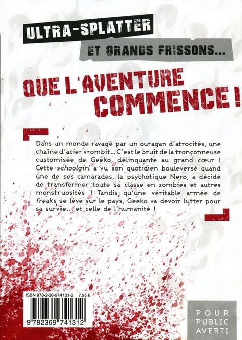 Dans un monde ravagé par un ouragan d'atrocités, une chaîne d'acier vrombit... C'est le bruit de la tronçonneuse customisée de Geeko, de´linquante au grand coeur ! Cette school-girl a vu son quotidien bouleverse´ quand Nero, une de ses camarades psychotiques a de´cidé de transformer toute sa classe en zombies et autres monstruosite´s ! Tandis qu'une ve´ritable arme´e de freaks se le`ve sur le pays, Geeko va devoir lutter pour sa survie... et celle de l'humanite´ !