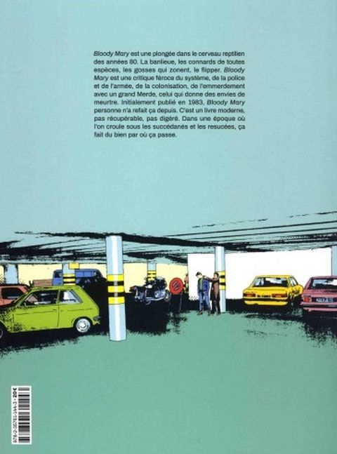 Bloody Mary est une plongée dans le cerveau reptilien des années 80. La banlieue, les connards de toutes espèces, les gosses qui zonent, le flipper. Bloody Mary est une critique féroce du système, de la police et de l’armée, de la colonisation, de l’emmerdement avec un grand Merde, celui qui donne des envies de meurtre. Bloody Mary, personne n’a refait ça depuis. C’est un livre moderne, pas récupérable, pas digéré. Dans une époque où l’on croule sous les succédanées et les resucées, ça fait du bien par où ça passe.