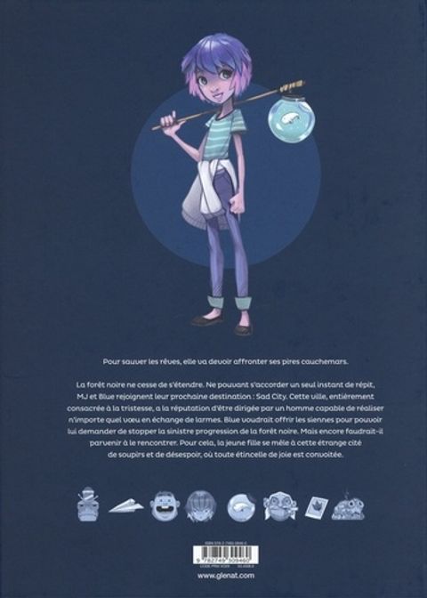 Le prix des larmes. La forêt noire ne cesse de s'étendre. Ne pouvant s'accorder un seul instant de répit, MJ et Blue rejoignent leur prochaine destination : Sad City. Cette ville, tout entière consacrée à la tristesse, a la réputation d'être dirigée par un homme capable de réaliser n'importe quel voeu en échange de larmes. Blue voudrait user des siennes pour pouvoir lui demander de stopper la sinistre progression de la forêt noire. Mais encore faudrait-il parvenir à le rencontrer. Pour cela, elle se mêle à cette étrange cité de soupirs et de désespoir. Elle y fait alors la rencontre de certains de ses curieux résidents, mais cela ne se fait pas sans mal, car à Sad City, toute étincelle de joie est convoitée. Dans ce deuxième tome de Blue au pays des songes, les rêves et l'imaginaire restent aux fondements de l'univers baroque et féerique créé par Davide Tosello.
