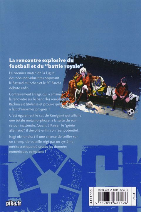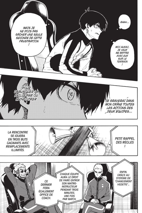 <div style="text-align: justify;">Le premier match de la Ligue des néo-individualistes opposant le Bastard München et le FC Barcha débute enfin. Contrairement à Isagi, qui a entamé la rencontre sur le banc des remplaçants, Bachira est titularisé et prouve qu’il a fait d’énormes progrès ! C’est également le cas de Kunigami qui affiche une totale métamorphose, à la suite de son retour inattendu. Quant à Kaiser, le “génie allemand”, il dévoile enfin son réel potentiel. Isagi obtiendra-t-il une chance de briller sur un champ de bataille régi par un système méritocratique où seules les données numériques comptent ?</div>