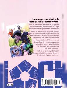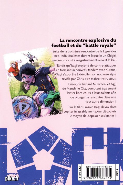 Suite de la troisième rencontre de la Ligue des néo-individualistes durant laquelle un Chigiri métamorphosé a magistralement ouvert le bal. Tandis qu’Isagi projette de contre-attaquer en formant un nouveau tandem avec Kurona, Nagi s’apprête à dévoiler son nouveau style révélé par Chris, son maître-instructeur. Kaiser, du Bastard Mu nchen, et Agi, de Manshine City, comptent également laisser libre cours à leurs talents afin de plonger la rencontre dans unetout autre dimension ! Sur le fil du rasoir, Isagi devra alors cogiter inlassablement pour découvrir le moyen de dépasser ses limites !