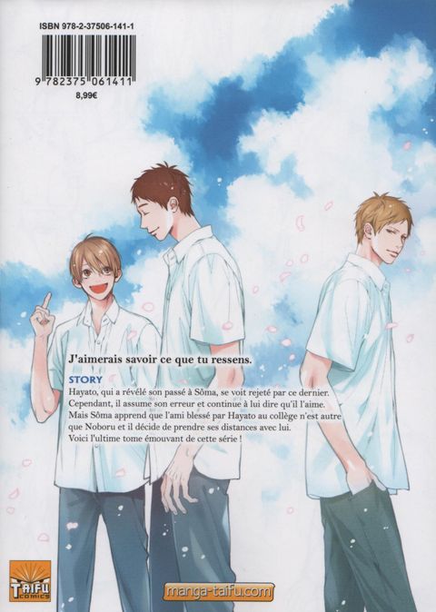 Hayato, qui a révélé son passé à Sôma, se voit rejeté par ce dernier. Cependant, il assume son erreur et continue à lui dire qu’il l’aime. Mais Sôma apprend que l’ami blessé par Hayato au collège n’est autre que Noboru et il décide de prendre ses distances avec lui. Voici l'ultime tome émouvant de cette série !
