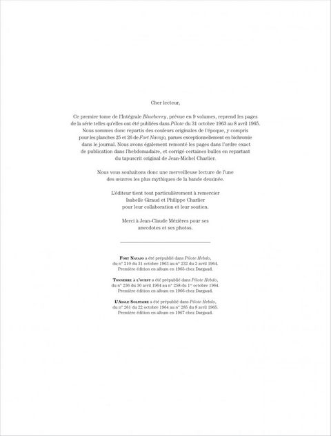 Le 10 mars 2012, Jean Giraud disparaissait. Cet immense auteur, considéré comme le plus grand par plusieurs de ses pairs, a laissé derrière lui une oeuvre considérable dont Blueberry est la véritable pierre angulaire. Les éditions Dargaud lui rendent ainsi un hommage en proposant une réédition de cette saga sous forme d'intégrales qui réuniront les nombreux épisodes dessinés par Giraud et scénarisés par Charlier avec plusieurs documents rares ou inédits. Une façon évidente de redécouvrir ce monument de la bande dessinée apparu dans le magazine en 1963.