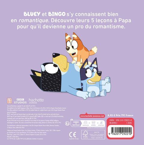 Soulevez les volets de ce livre et le romantique (enfin, le romantisme) n'aura plus de secret pour vous (enfin, presque) ! Un livre ou retrouver l'univers drôle et attachant de Bluey Une histoire hilarante mettant en scène Bluey, sa famille et... Monsieur Licorne (oh, non... Pas Monsieur Licorne)Des volets à soulever, qui cachent une drôle de surprise à chaque fois Dès 2 ans.Résumé : BLUEY et BINGO s'y connaissent bien en romantique. Découvre leurs 5 leçons à Papa pour qu'il devienne un pro du romantisme.